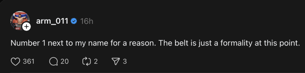 शीर्षक के अवसर से वंचित किए जाने के बाद, जिसके वह हकदार थे, अरमान ज़ारुक्यन इस तथ्य के आदी हो गए हैं कि वह वर्तमान में सर्वश्रेष्ठ यूएफसी लाइटवेट और बिना बेल्ट के चैंपियन हैं। ज़ारुक्यन ने हाल ही में थ्रेड्स पर पोस्ट किया: